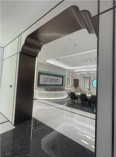 通往會(huì)客廳的曲線(xiàn)線(xiàn)條包邊不銹鋼門(mén)洞。